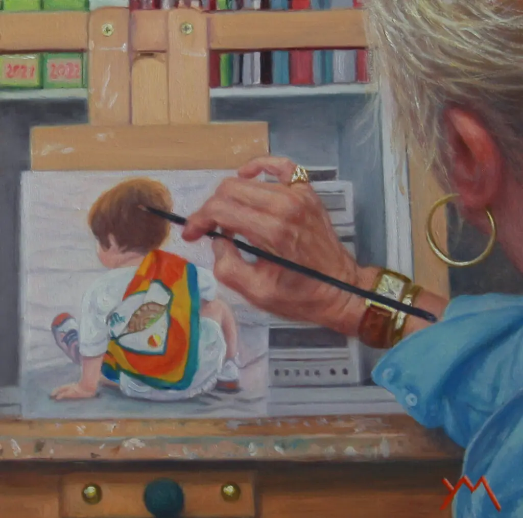 I received my first portrait commission in Italy. The owners of the farm where I rented an apartment wanted a painting of their three adult children, two daughters and a son. I suggested to make three separate portraits so that later they could each have their own portrait. They all thought that was a good idea and so it happened. I took a few photos of them in the late afternoon light and imagined painting the farm's surroundings as a continuous landscape behind them, making it a triptych. I started working on it at home in the Netherlands in the winter and brought the result to Tuscany the following summer. The portraits were received with love and enthusiasm and now, some 20 years later, this painting "An Italian Family" still hangs at the same place in the living room of the farm.