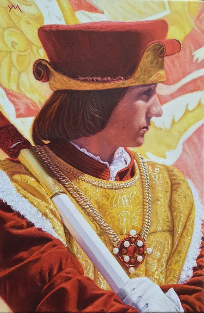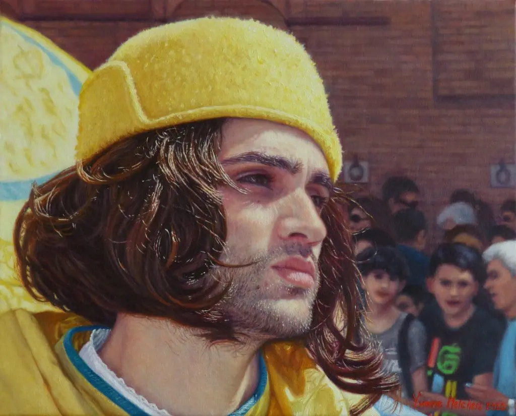 A pageant, the Corteo Storico, precedes the race, where modern-day Italian boys and men dress up in wigs and traditional costumes for the historical procession, carrying colorful banners representing a particular district of the city of Siena. Fascinated by this medieval event, Melchers pays tribute to it by superbly capturing the portraits of these smart Italians showing off their beautiful regalia, as well as the alluring sensuality, pride, and passion expressed on their handsome faces. The Siena Palio series is Melchers’ tribute to her beloved Siena, and is marked by the exquisitely detailed depiction of extravagantly patterned or embroidered fabrics in a kaleidoscope of dazzling colors"